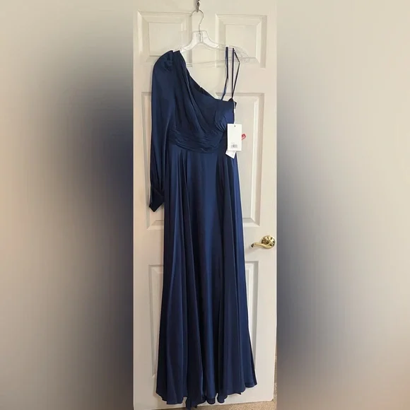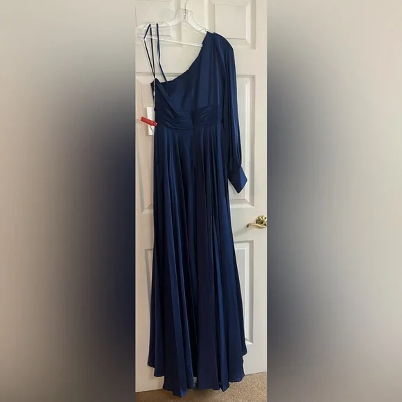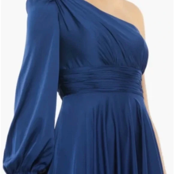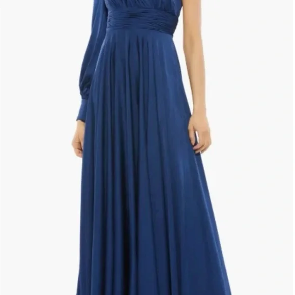 Mac Duggal NWT Chic one-shoulder design. Flowing royal blue fabric. Perfect for formal events. Mac Duggal #67866Royal blueNWTFully lined Concealed back zipper 2-side pockets 100% polyester Bishop sleeve/button cuffPit-to-pit 16”Length front 62”Back 64” Approx.