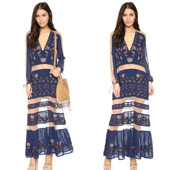 Rare For Love & Lemons Niccola Long Sleeve Maxi Dress with Mesh Cut Outs in Blue