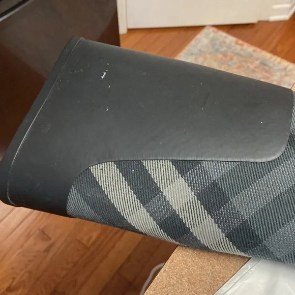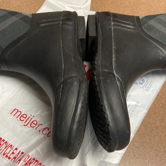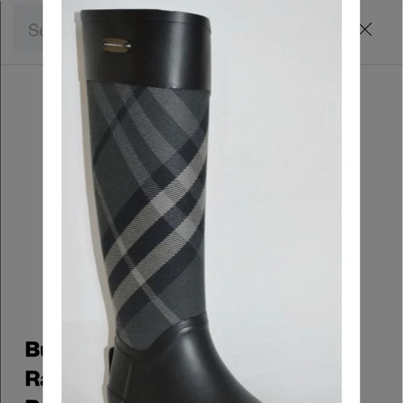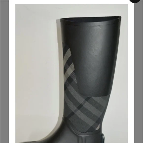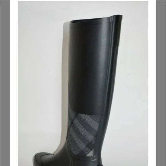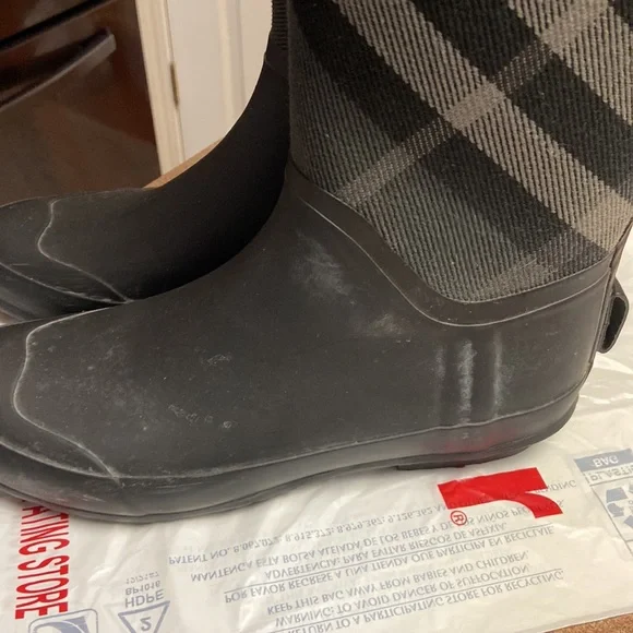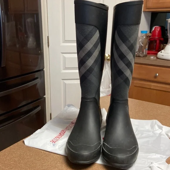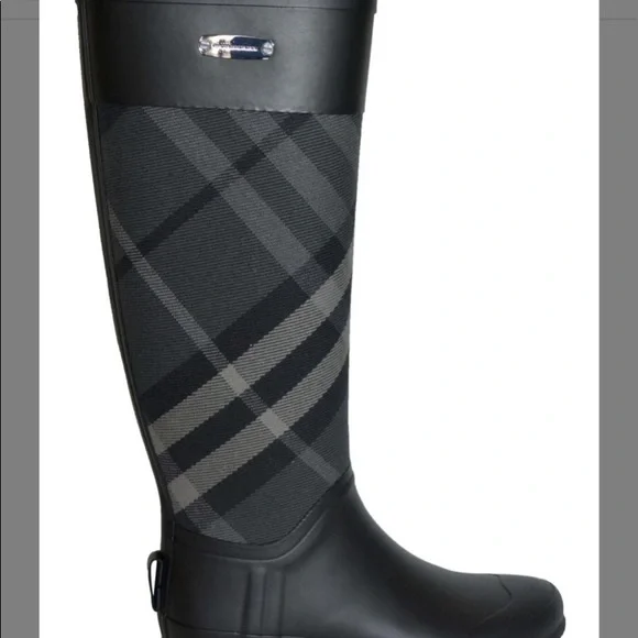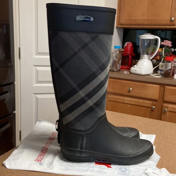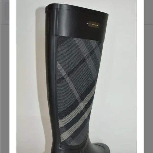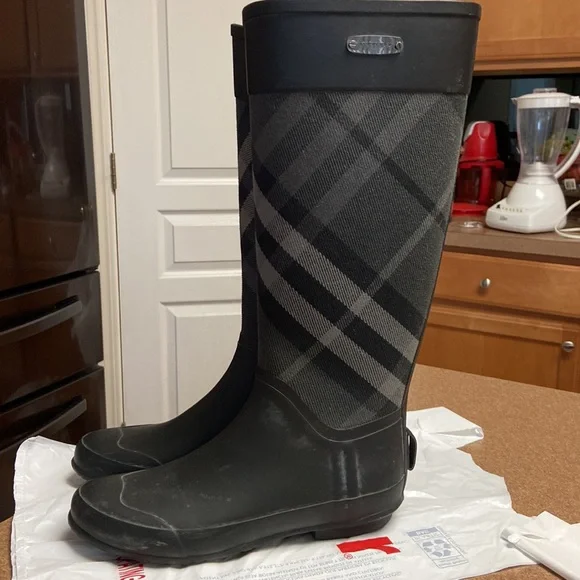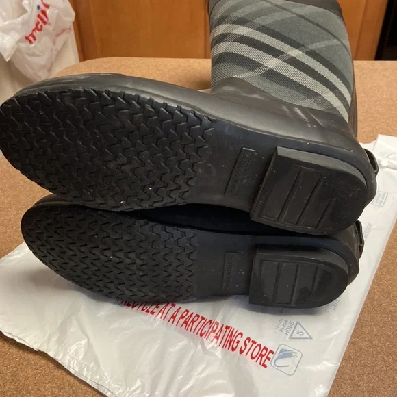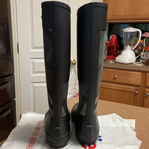 Tall rubber & canvas coated charcoal rain boots. Authenticity plaque on outer shaft. Pull up tan on heel area. Signature Cushioned insoles. Normal Patina color wear on exterior....