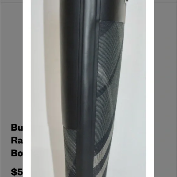Tall rubber & canvas coated charcoal rain boots. Authenticity plaque on outer shaft. Pull up tan on heel area. Signature Cushioned insoles. Normal Patina color wear on exterior. Fading on interior size & serial numbers. Very good used condition. 13 circumference 14 inch shaft