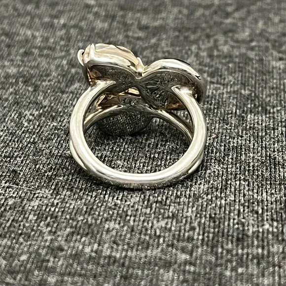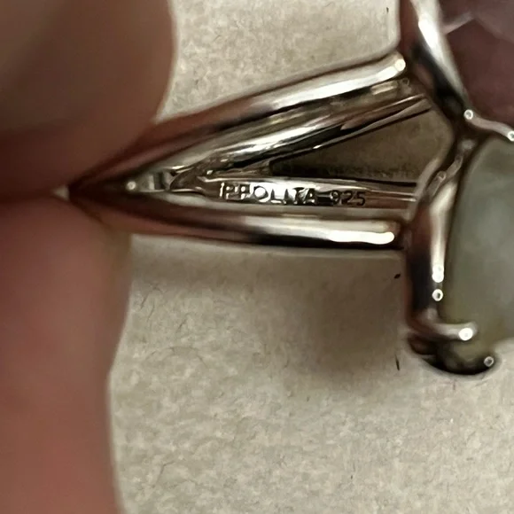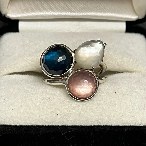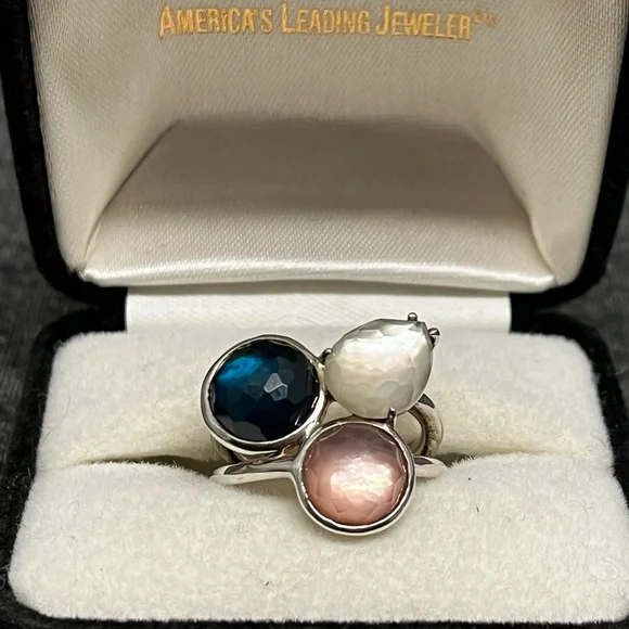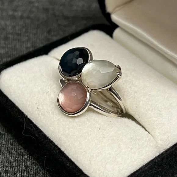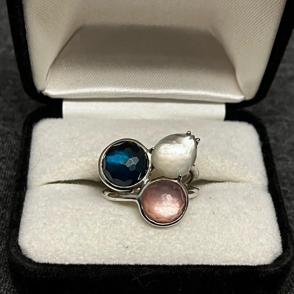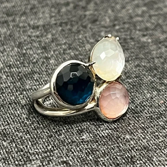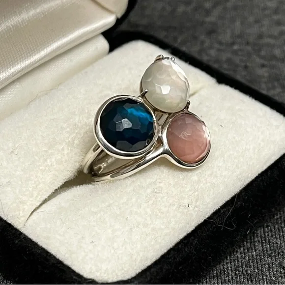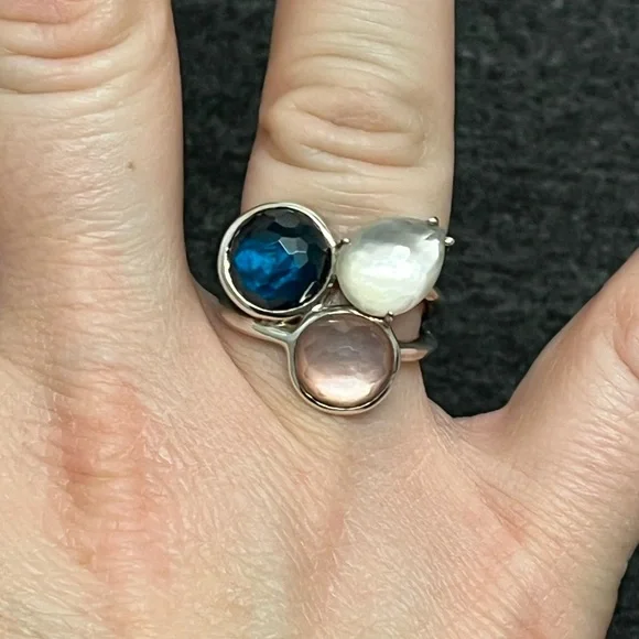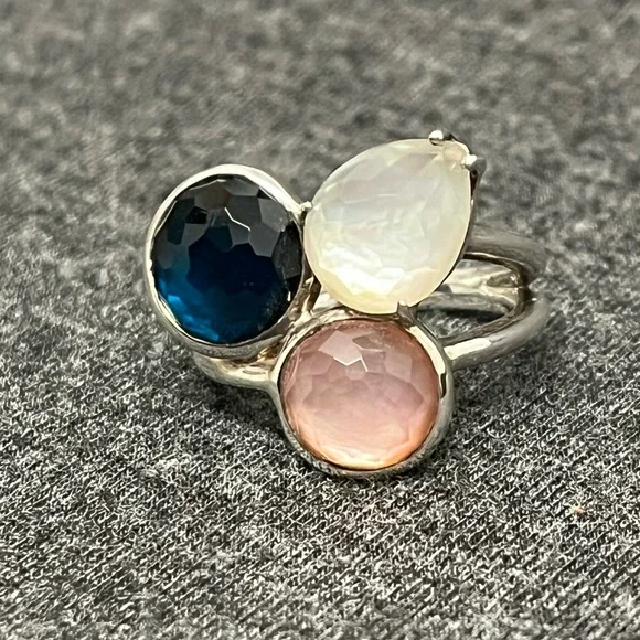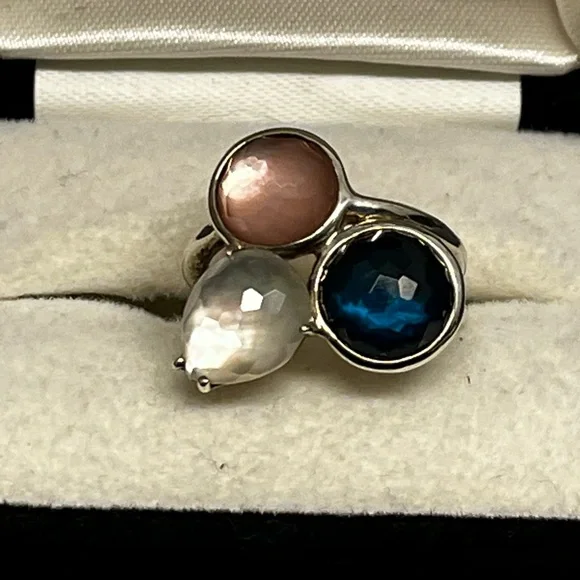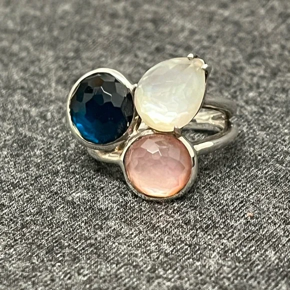 IPPOLITAMother of Pearl & Quartz Doublet Cocktail RingEstimated item measurementsMeasurements: Band Width 2.7mm, Ornament Width 21mm, Ornament Length 19.3mmMetal Type: Sterling SilverMarks: 925, Designer SignatureTotal Item Weight (g): 8.1Collateral: Generic BoxStone Disclaimer: Stone carat weight not provided due to limitations regarding cut/shape.Gemstone: Quartz, Mother of PearlExcellent used condition. Deep blue quartz, pink mother of pearl and white mother of pearl stones combine to create a stunning colorful piece. Can dress it up or down. Size 7