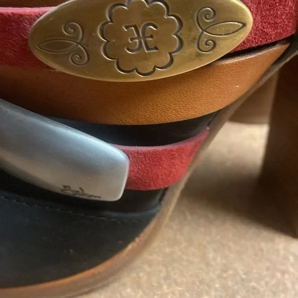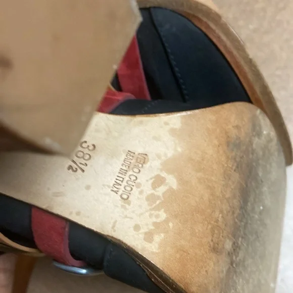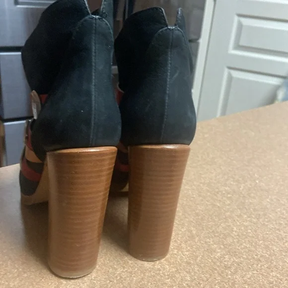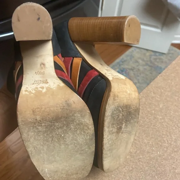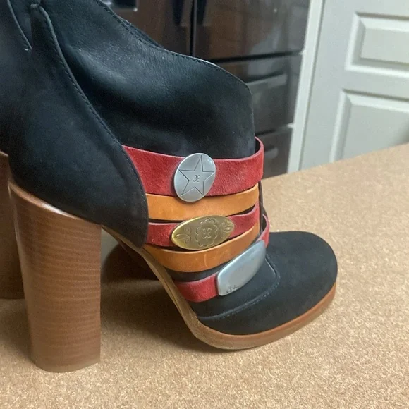 Unique & Rare gorgeous black oil based leather ankle boots. Square toe line multi colored vamp straps with metal logo detailing. Leather lined & soles. Luxury footwear. Minor handling scratches. Super quality & stylish. Made in Italy. EUC