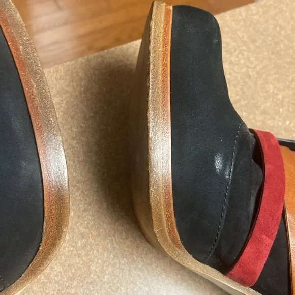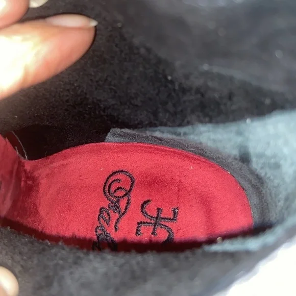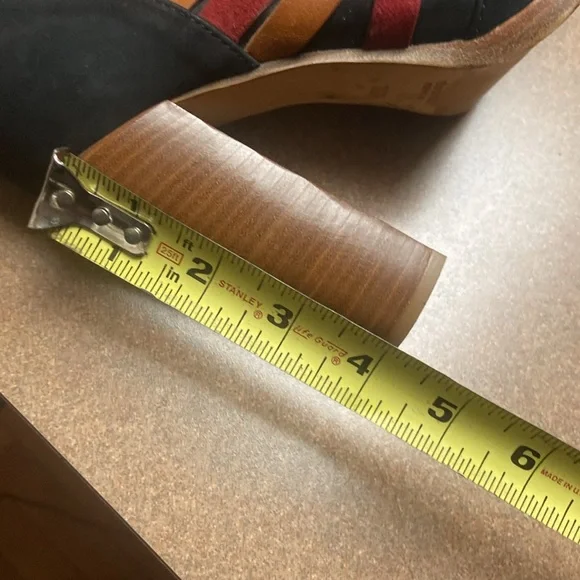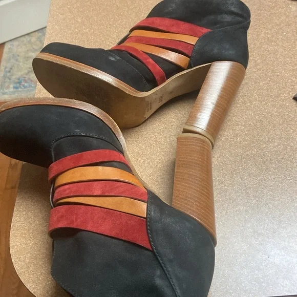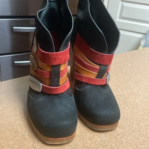Unique & Rare gorgeous black oil based leather ankle boots. Square toe line multi colored vamp straps with metal logo detailing. Leather lined & soles. Luxury footwear. Minor...