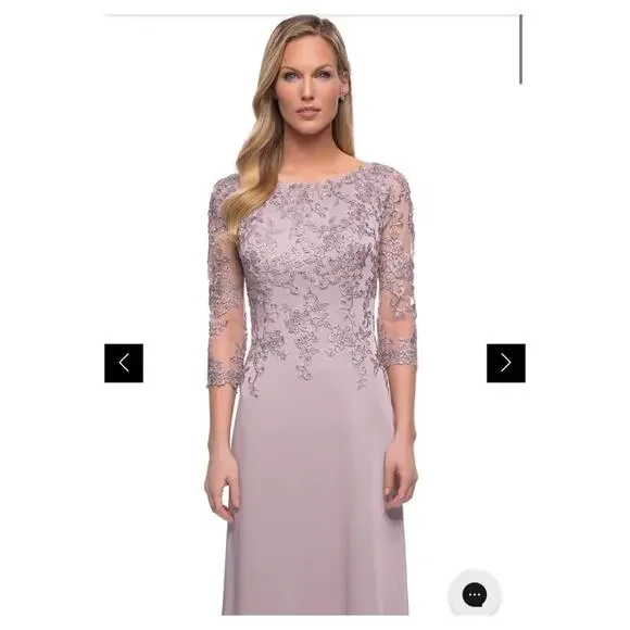 NWOT La Femme Mauve Gown 29251 Long gown with jersey column skirt and lace bodice. High neckline and sheer lace sleeves. Back zipper closure.Size 10. New with tags.Tags: evening, event, formal, cocktail, wedding guest, gala, gown, ball, party, designer, prom, charity, bridesmaid, ceremony, sequin, mother of the bride, modest