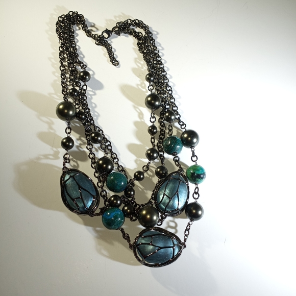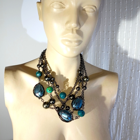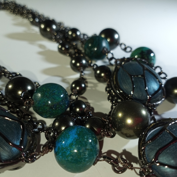 Over the top statement necklace with caged handprints lucite beads, pears and semi precious stones.Gunmetal plate, gorgeous color pallet, unique and RARE find! Perfect condition