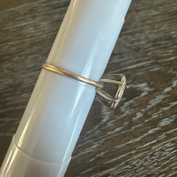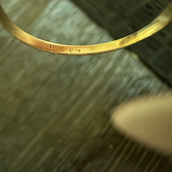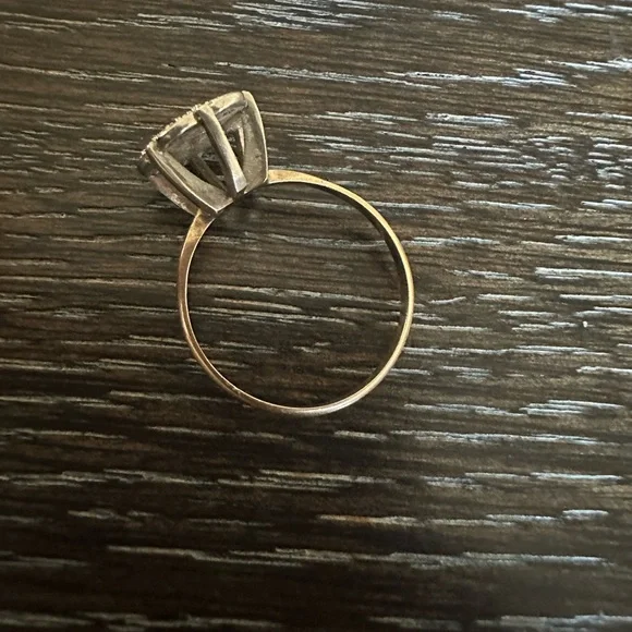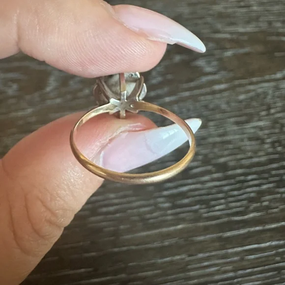 Gorgeous vintage bicolor 10kt gold ring7 small diamondsHigh profile setting White gold piece with yellow gold bandSize: 8.25Weight: 2gStamped: 10ktMakers Mark: TWSetting sits 8mm high off of the fingerWear: shows some dirt in setting thankfullyit is all open and can easily be polished and shined up. Band has some signs of wear but no notches or dentsRare find for sure!