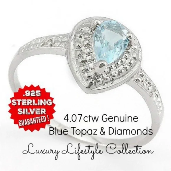 4.07 ctw Genuine Blue Topaz with Diamonds, .925 Sterling Silver, Ring Size 8