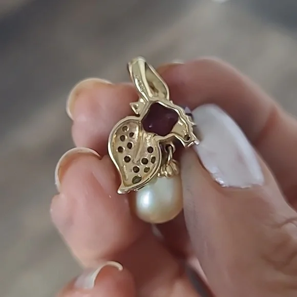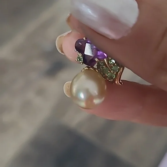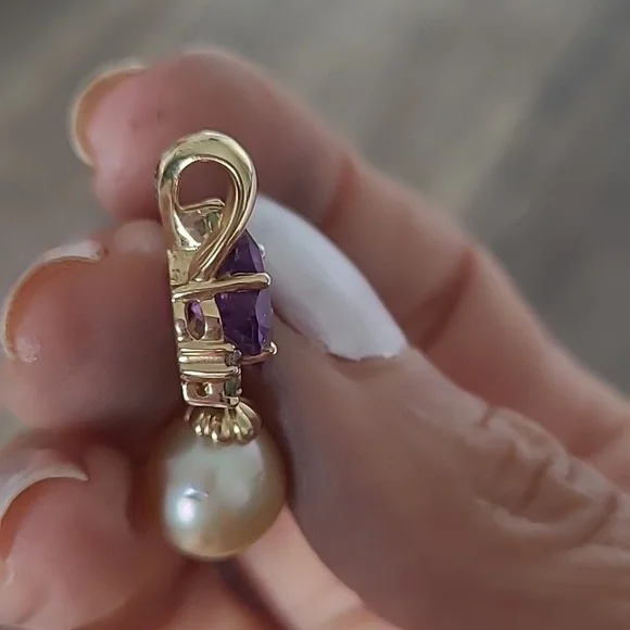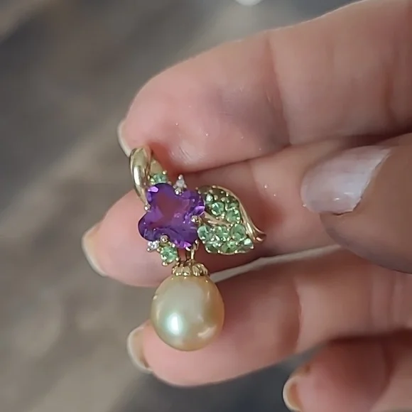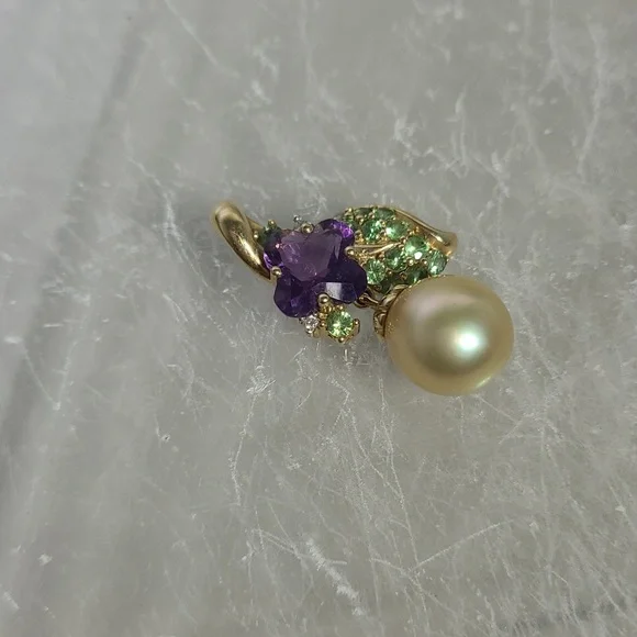10 mm Golden South Sea Pearl, flower shaped amethyst, 14 round faceted tsavorite garnets and 2 round cut diamonds in 14 Kt gold.Stamped 585 and "LTP" on the bail.***PENDANT ONLY