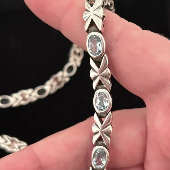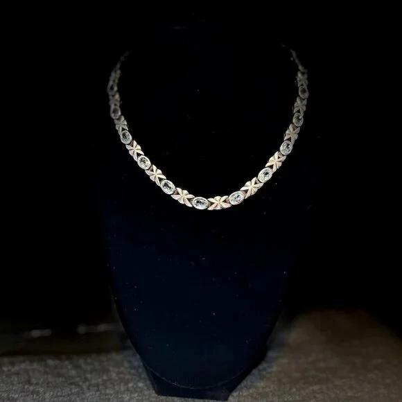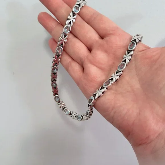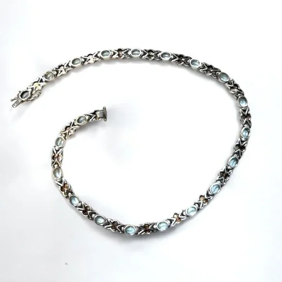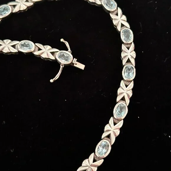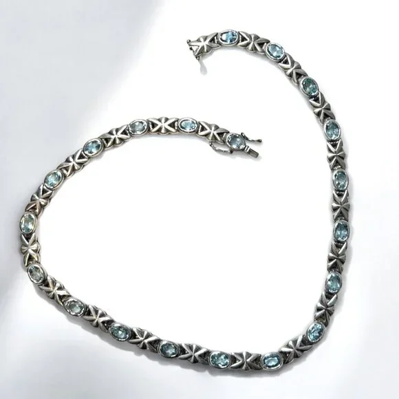 This vintage necklace is definitely a head turner! Acquired years ago but rarely worn, it remains in very good condition, displaying remarkable craftsmanship and meticulously matched blue topaz stones. The necklace closes with a double safety box clasp.This necklace is unmarked but confirmed via XRF to be sterling silver.Length: approx. 16"Weight: approx. 55 grams Comes from a smoke free home.Bundle this with other items from my closet for a discount! Reasonable offers are welcome.