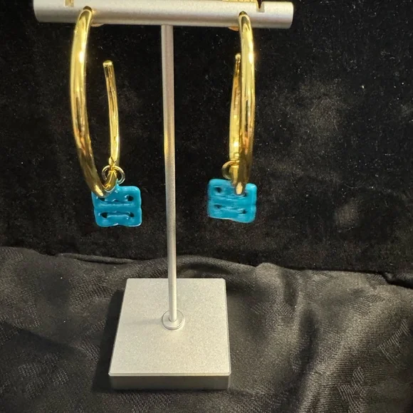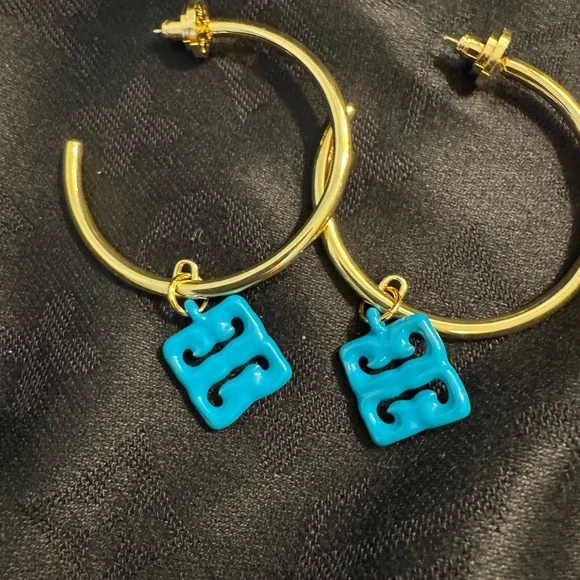 Elegant Tory Burch gold hoop earrings featuring a vibrant turquoise charm. Perfect for adding a pop of color to any outfit.Ships today.