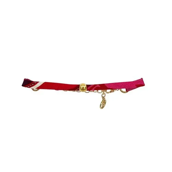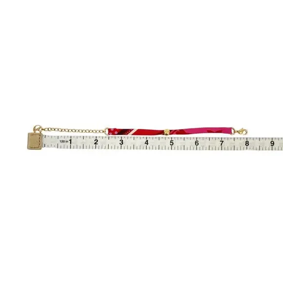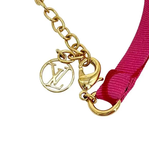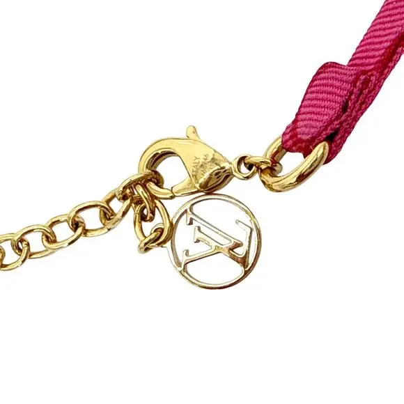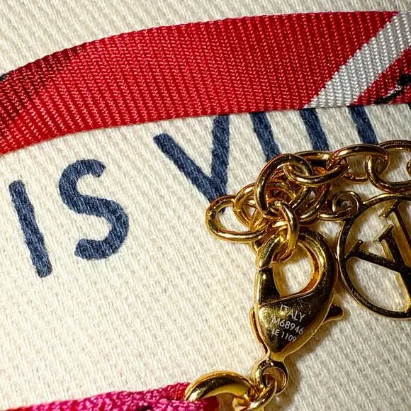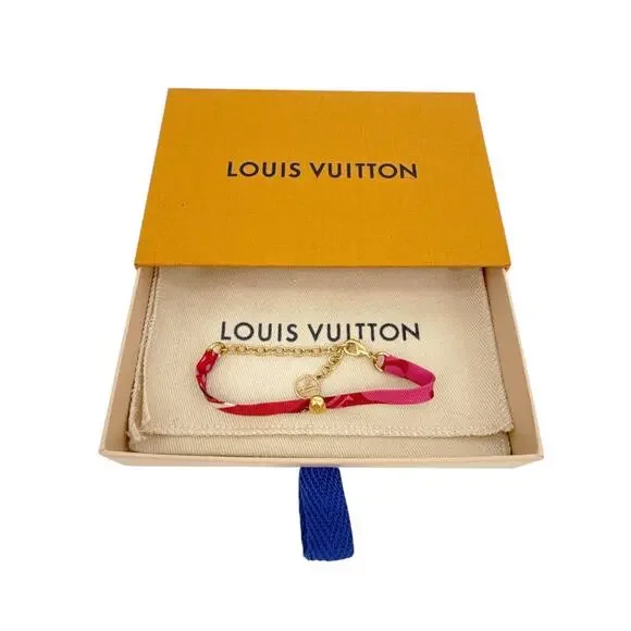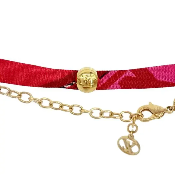 LOUIS VUITTON Silk Be Mindful BraceletThis exclusive collection of Louis Vuitton accessories & textiles gives their printed silks a second life thanks to the House´s eco-design approach, know-how & sustainability goals. Each product in the Be Mindful collection is unique, created based on the model of upcycling (the art of transforming materials & products from previous collections into new objects with greater utility or aesthetic value). MATERIAL & DETAILSSilk Color(s): Red & pinkModel No. M68946Date code: LE1109 (Made in Italy 2019)Measurements: 8in end to end with 2.5" of adjustable chainCONDITION Very good. Some superficial scratches on the hardware. Dust bag & box are included. *PLEASE NOTE: All of the pictures are of the actual product. None are stock photos. Color(s) may vary depending on lighting.Louis Vuitton is a registered trademark of Louis Vuitton. FLYKAMP is not affiliated with Louis Vuitton.