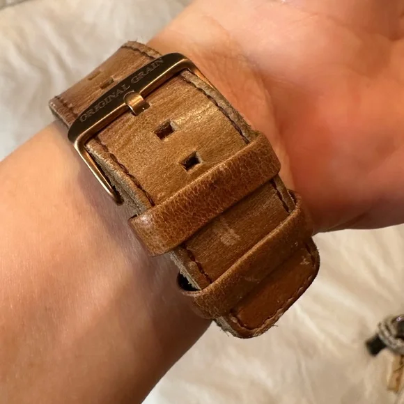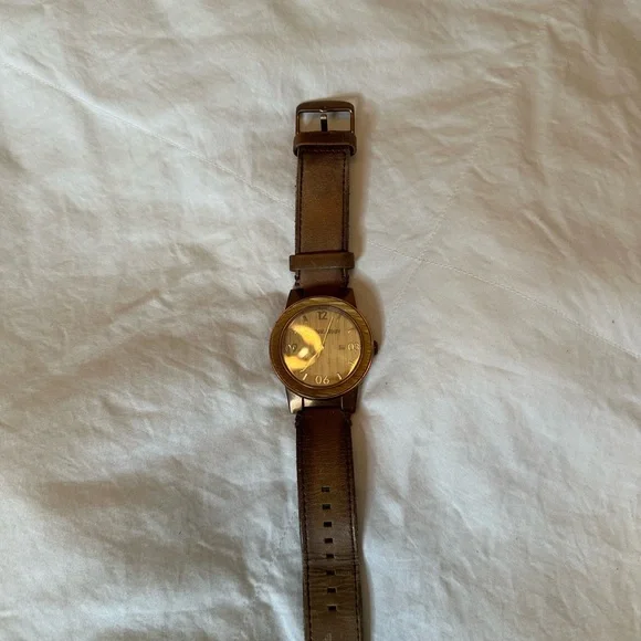 Mens Elegant wooden watch by Original Grain. Features a natural wood face with brown accents. Worn daily but stilll in very good shape! Needs new battery.