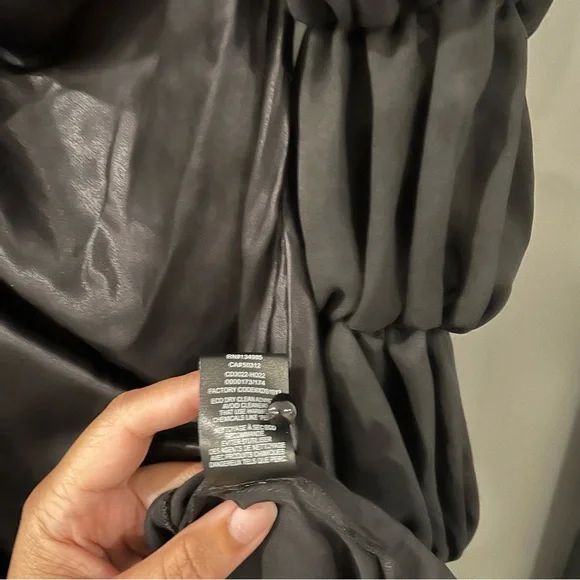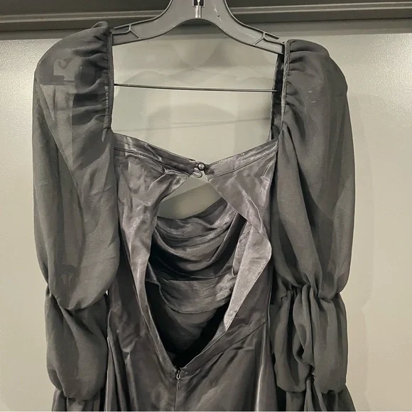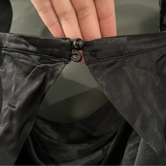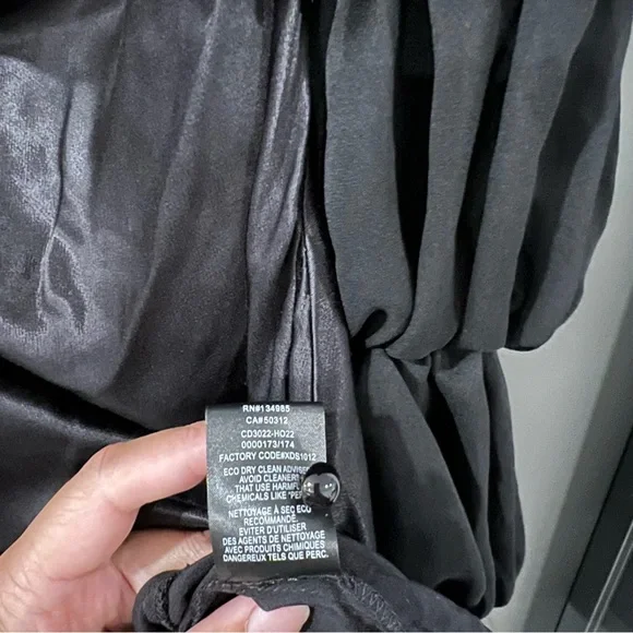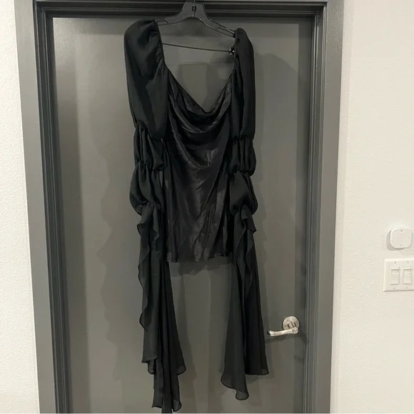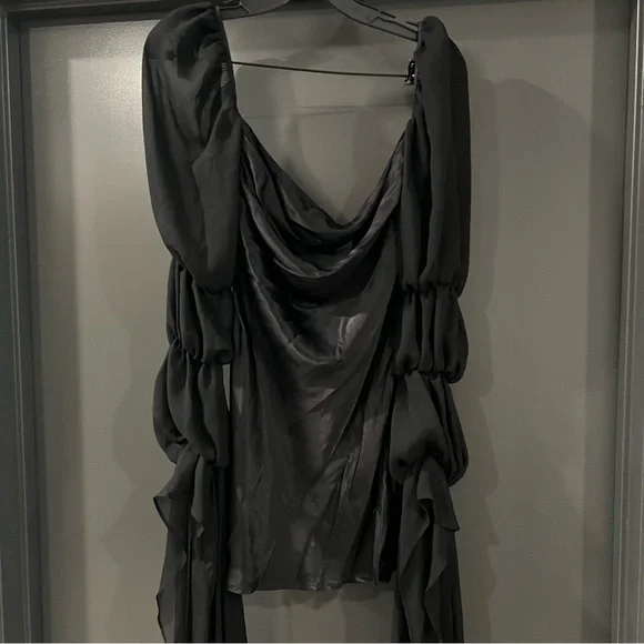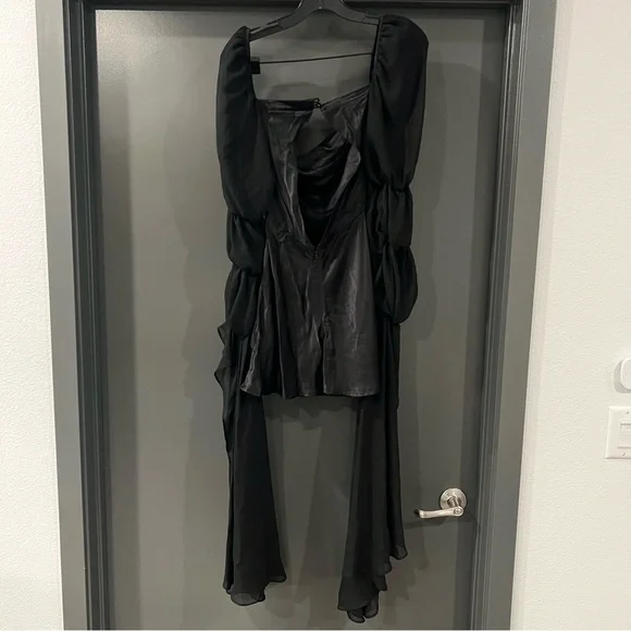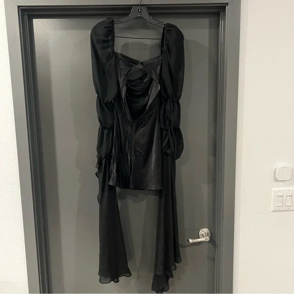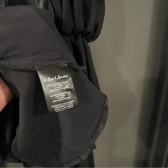 For Love and Lemons black willow mini dressSize: XXSIn excellent condition.Self: 53% ecovero, 47% viscoseContrast Fabric: 100% recycled polyesterMade in ChinaDry clean onlyFully linedHidden back zipper closureBack cut-out with loop button closureExaggerated sheer mesh sleeves with elastic trimDraped satin fabricMissing a button, but comes with an extra button.