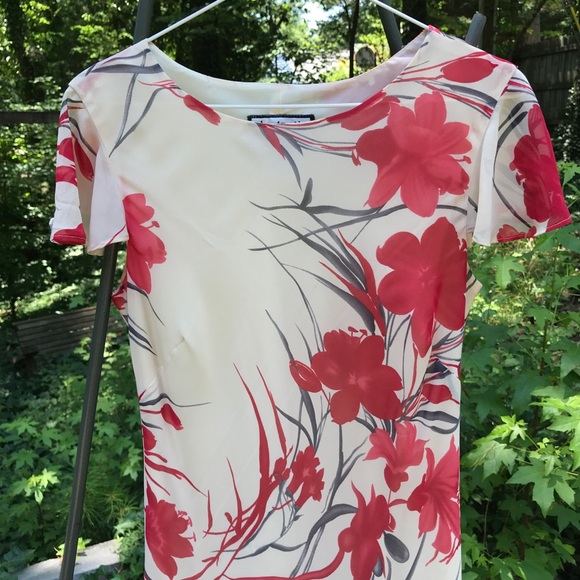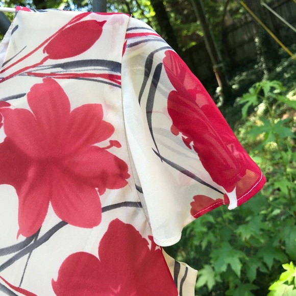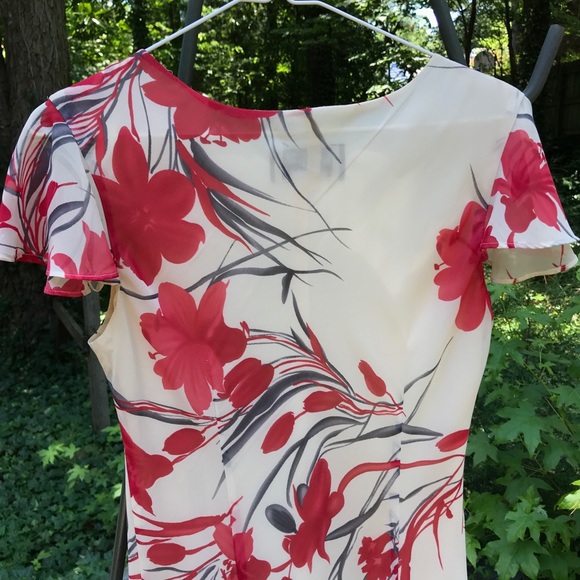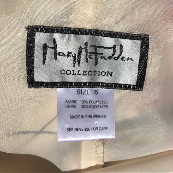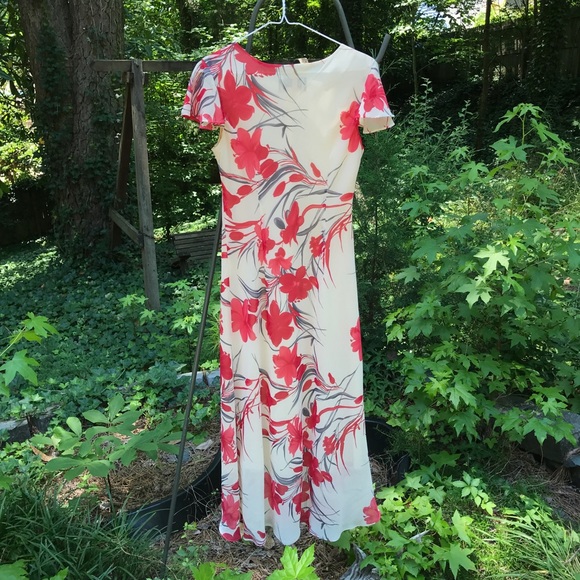 This gorgeous floral gown by American haute-couture goddess Mary McFadden has two layers of chiffon and a slender flowing silhouette with a feminine ruffle edge hem. Semi-sheer cap sleeves. It’s easy to see why McFadden’s dresses are featured at numerous museums, including the Met in NYC. Excellent condition. Size 6. One of a kind.