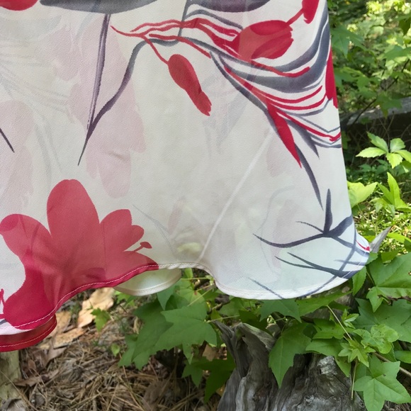 This gorgeous floral gown by American haute-couture goddess Mary McFadden has two layers of chiffon and a slender flowing silhouette with a feminine ruffle edge hem. Semi-sheer...
