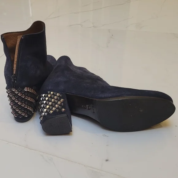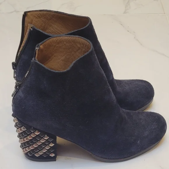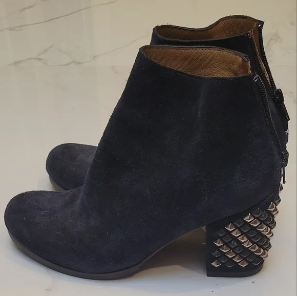 Calleen CorderoBlue Suede Studded Heel Back Zip Ankle Bootwith a .25" front platform back zipper studded heel rigid rubber sole4 inch shaft3 inch heelSize:8retail...