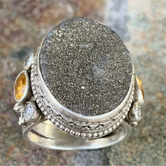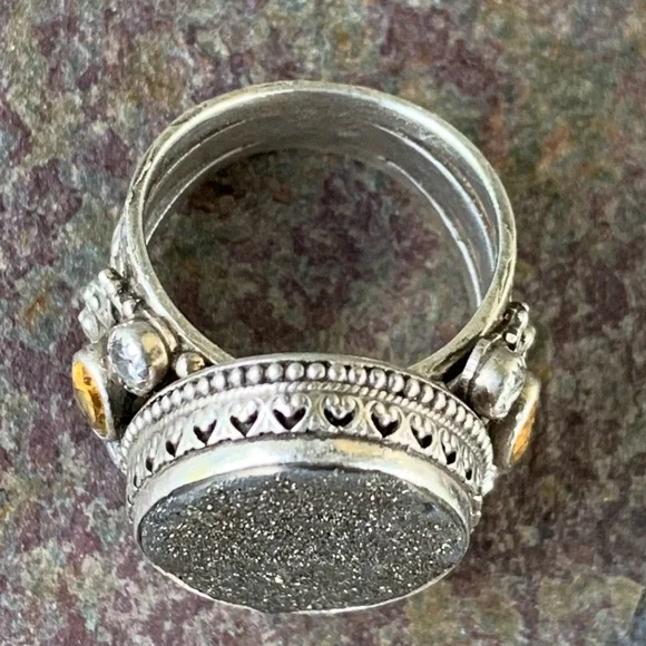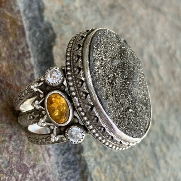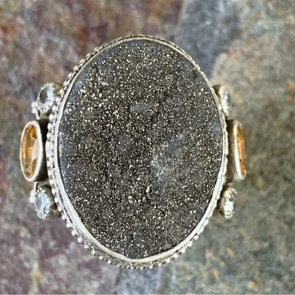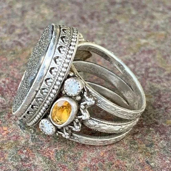 Benny & Valerie Aldrich Stunning Large Druzy Ring! Beautiful Dark Gray Center Druzy Stone, Set in Beautifully Detailed Sterling Silver, Adorned with Citrine Ovals & White Topaz...