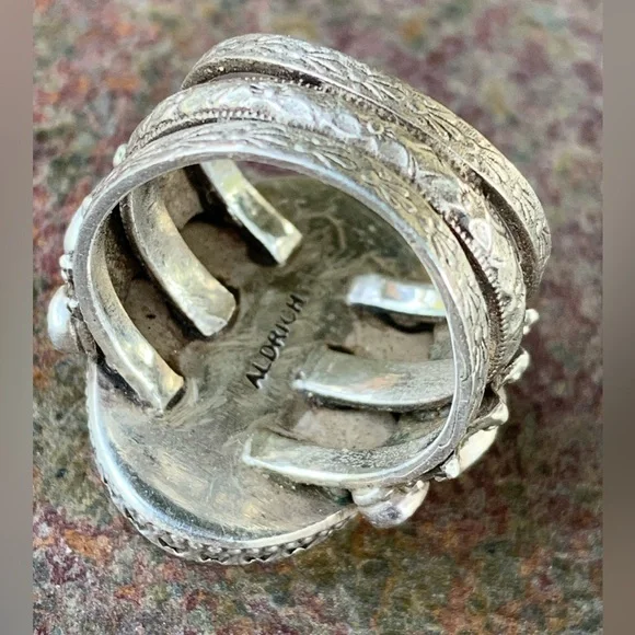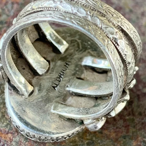 Benny & Valerie Aldrich Stunning Large Druzy Ring! Beautiful Dark Gray Center Druzy Stone, Set in Beautifully Detailed Sterling Silver, Adorned with Citrine Ovals & White Topaz Rounds, 3 Ring Band, Size 8-1/2 and in excellent, New Condition ($599). Overall Center Druzy Oval 3/4” wide x 15/16” high, Band tapers from 5/8” to 1/4” at back. Just Stunning!!