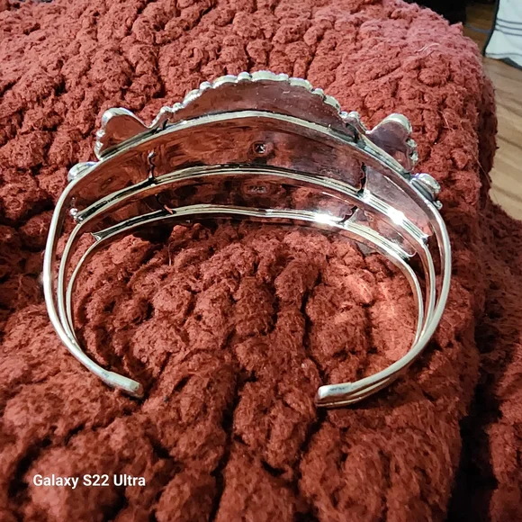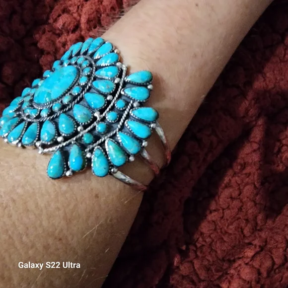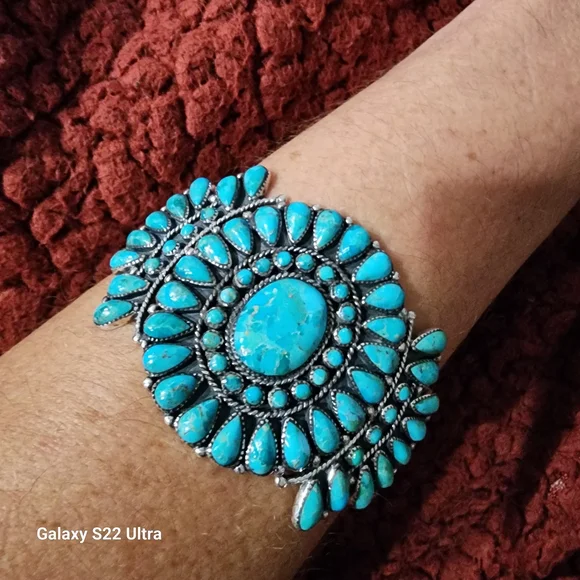This elegant bracelet features vibrant turquoise stones, perfect for adding a pop of color to any outfit. Its intricate design makes it a standout piece in any jewelry collection. signed genuine Sterling silver and turquoise!°