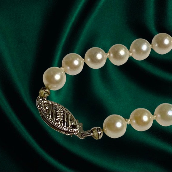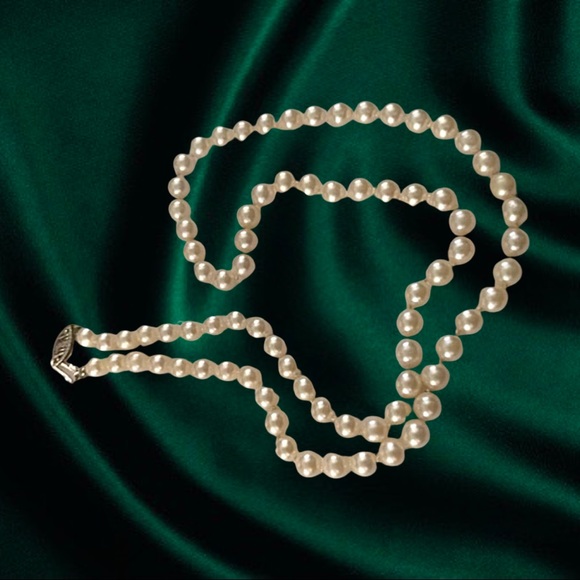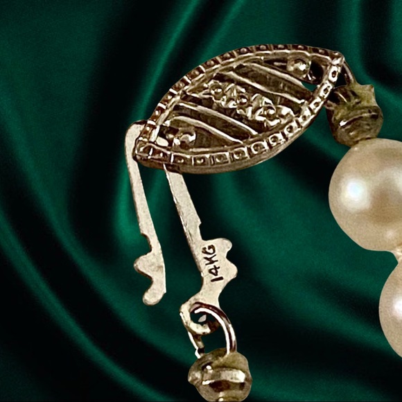 These are NOT oval but round cultured pearls and are AA quality (not the top but very nice luster & surface). No major wear to pearls so the luster is good. Nice size and length and pearl strand is knotted. 14k, white gold pearl clasp. Shown under lamp and natural daylight. Pictured against a solid white background as they should be to show color and luster. Size is 5.5mm down to 5mm average. Very light cream with medium rose´ hue