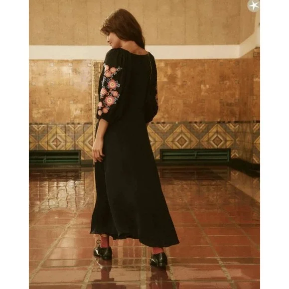 Model is 5´8 1/2" wearing size 1.An ode to classic Americana, The Sagebrush Dress. references classic cowboy shirts through the ages. This signature silhouette is perfectly flattering due to its low-cut v-neckline, curved waist seam, and flowy circle-cut skirt. Other charming details include pleated sleeves with elasticated openings, contrast piping edges, and cheerful, textured floral embroidery. 100% ViscoseDry Clean Only