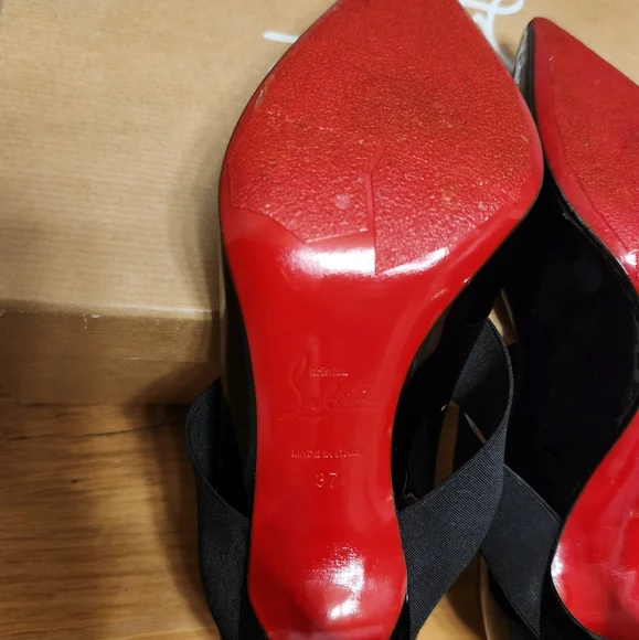 sold.with a box from another pair of my loubs.No dust bag!shoes have been retouched with paint and have non skidstickers on the bottom Soles.no visible wear on patent leather heel caps are still in great condition.from one to 10 it´s a 7 conditionheel is 4 inchesfit is typical loubotin - narrow and better hals size down
