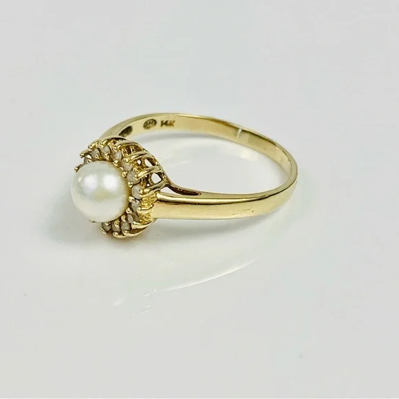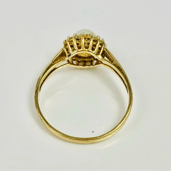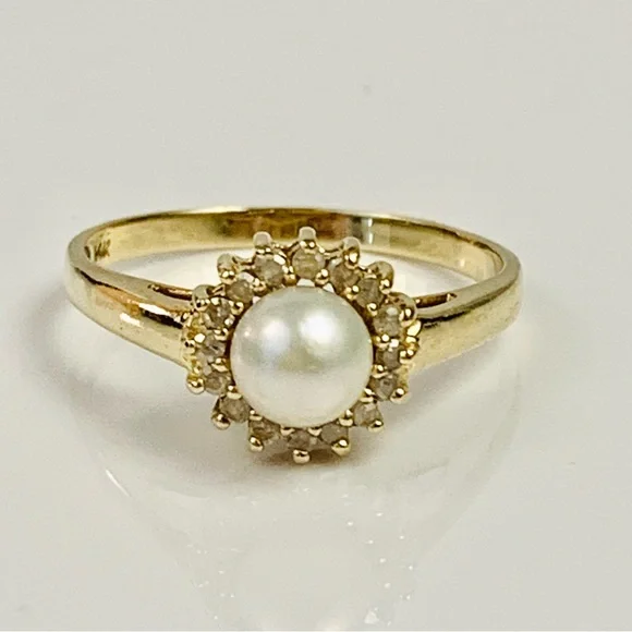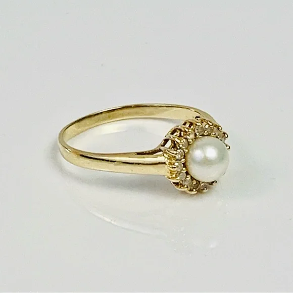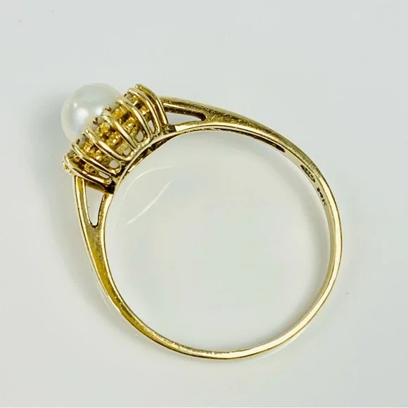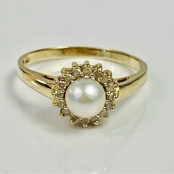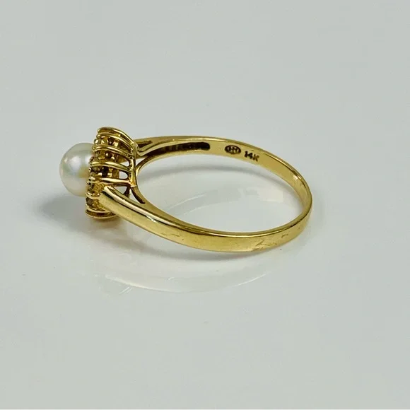 14K Yellow Gold Pearl & Diamond Cocktail Ring Size 7