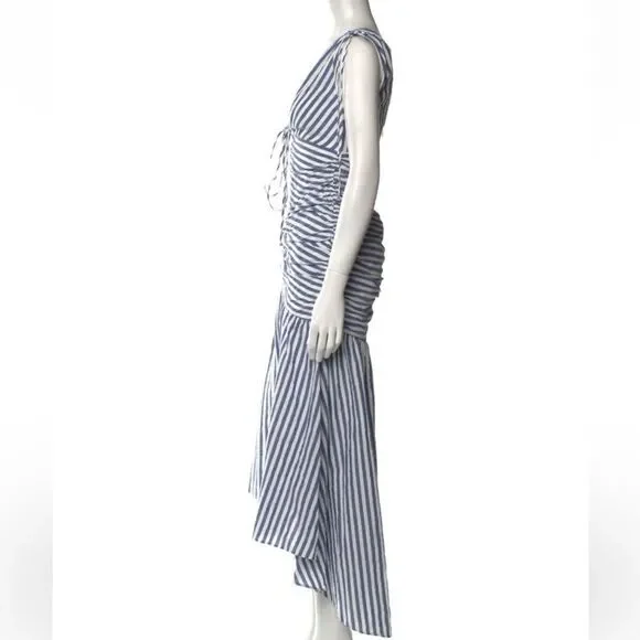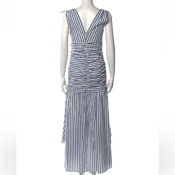Lightly used Blue and white StripedRuffle EmbellishmentSleeveless with Plunge NecklineConcealed Zip Closure at Back99% Cotton, 1% Spandex; Lining 100% Cotton