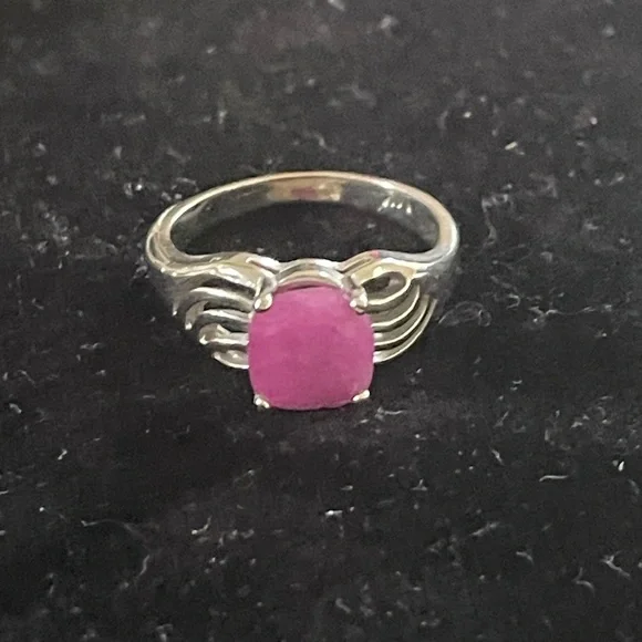 Natural square cushion faceted Ruby crafted on 14k white gold.A Filigree style!!!Size 7.26 x 7.19 x 4.77 mm.Color: Purple Pink Stone weight: 2.57 CT.Total weight: 3.6 grams.Ring size: 5.50 - 5.75Statement Ring with a Unique Design!!!In perfect condition.