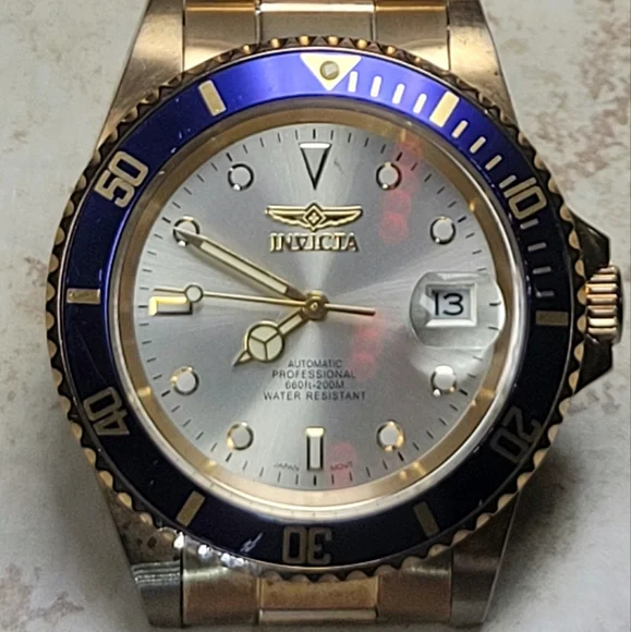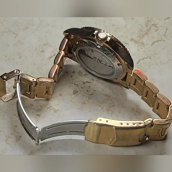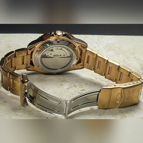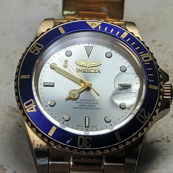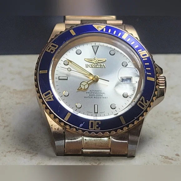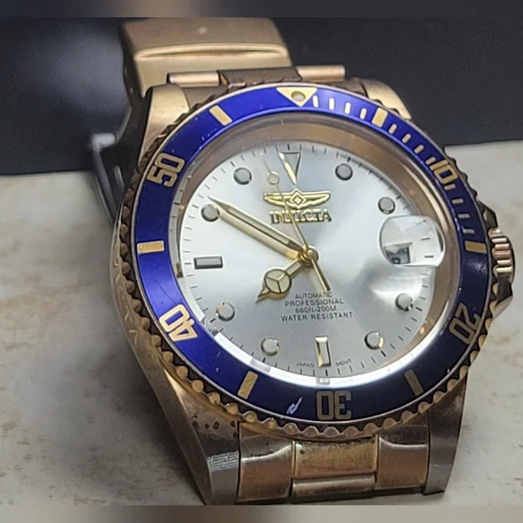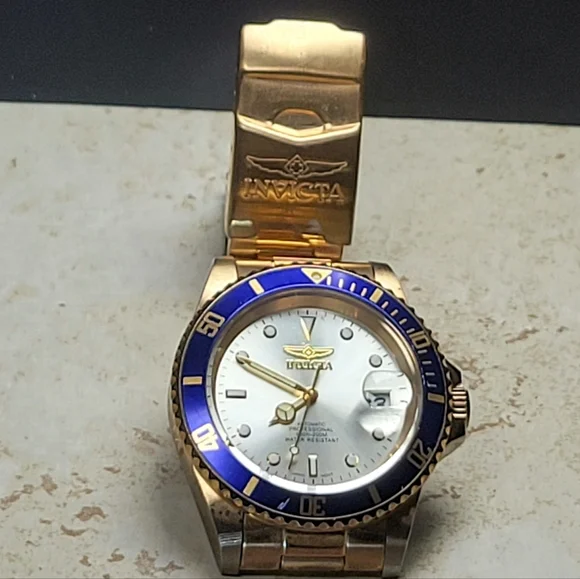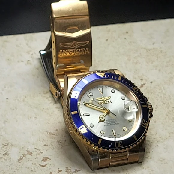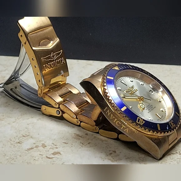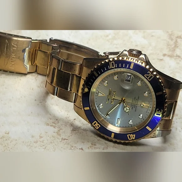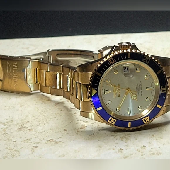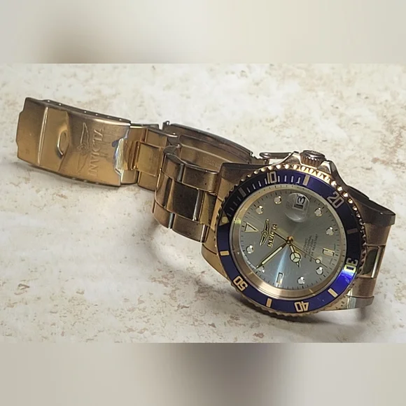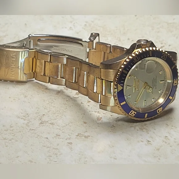 Invicta mens watch. Pre Owned with normal wear present. In great working condition new battery installed. Gold tone and blue around face of watch. Measures 8 inches length.740mm Ltd Ed Men Pro Diver Automatic Champagne Dial Two-tone SS Watch