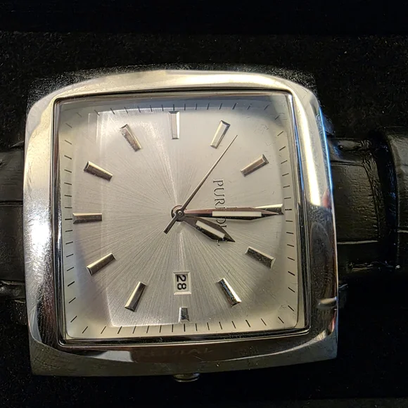 This sophisticated black watch features a striking crocodile pattern on its leather strap, perfectly complementing its sleek design. The square face and stainless steel case add a...