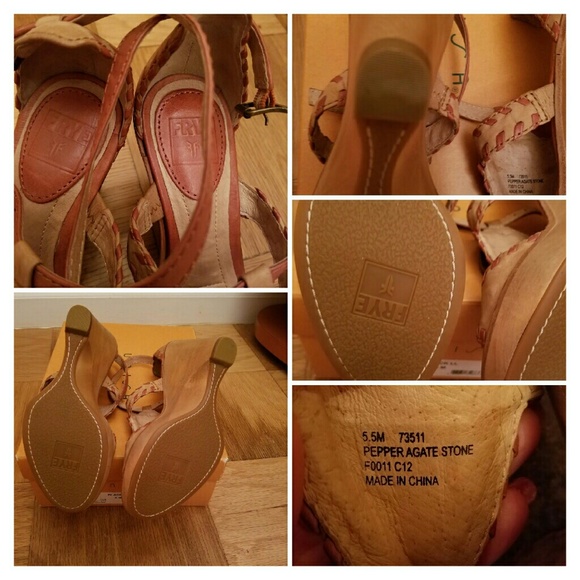 Frye Pepper Agate Stone (Indian Red Veg Tan)Wedge Sandals. Limited editions . Veg tan leather upper.Features natural agate stone slices that reveal beautiful crystals. Contrast leather chevrons on strap. Smooth leather lining. Lightly cushioned footbed. Split heel with durable rubber outsole. Must have for summer Brand New never worn. No box, this box on the pictures it´s for show only, no tags. Heel height 4" and 1" platformReasonable offers are excepted. Please note that this item already is reduced from original price.
