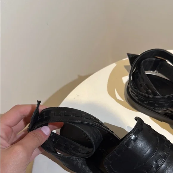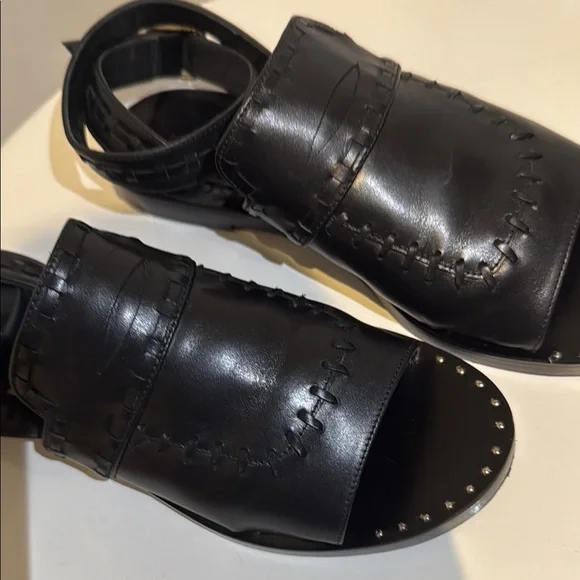 Stylish black leather sandals. Features a unique stitched design. Perfect for casual wear.