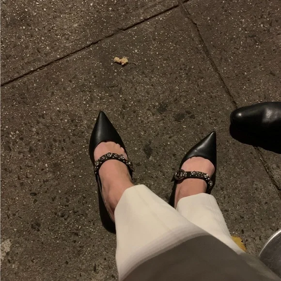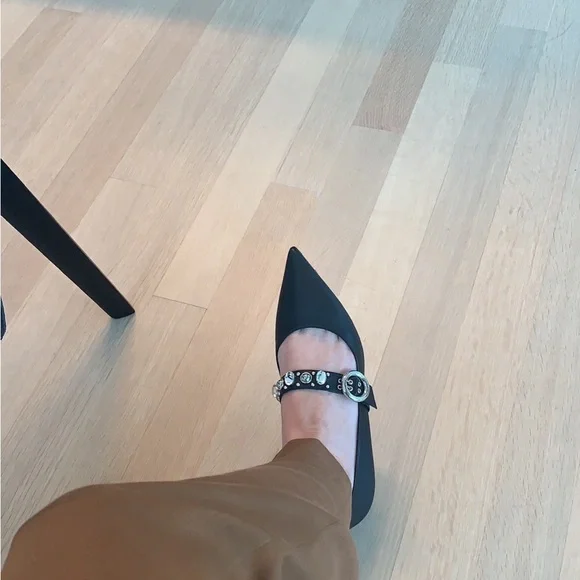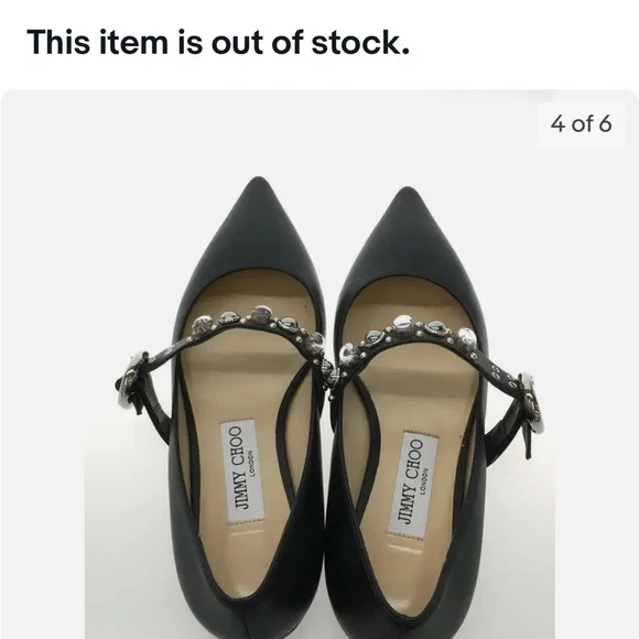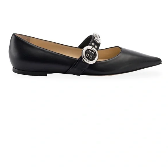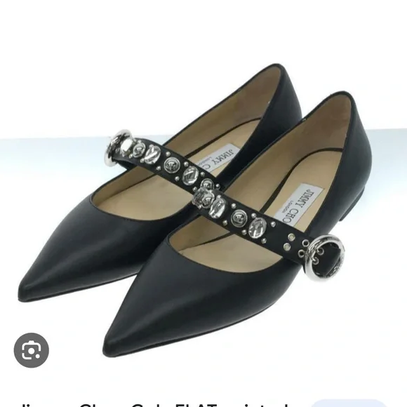 Jimmy Choo Gels point-toe leather Mary Jane flats. I’m good condition, with some scoff marks in the front.