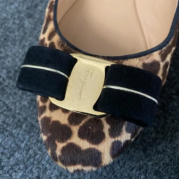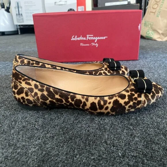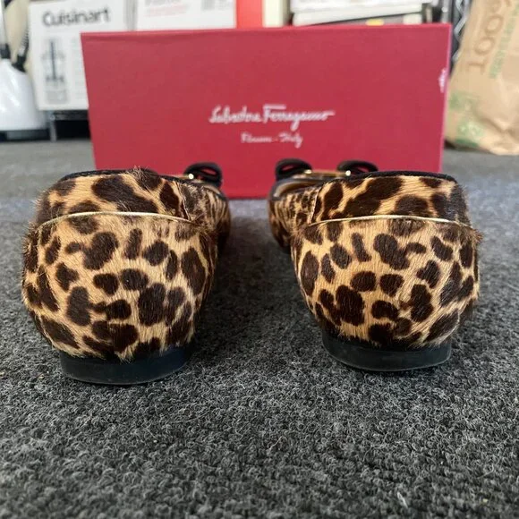 Ferragamo´s classic ballet flat in a leopard print calf hair. Upper: calf hairLining: cow leatherSole: leather insole and soleToe shape: round toeHeel: 1 cmMade in ItalyIncludes: dust bags