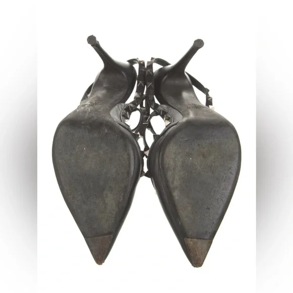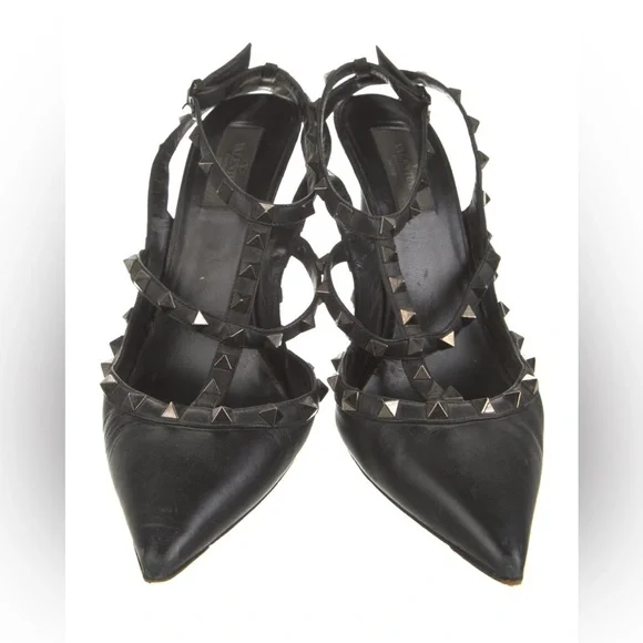 Description•Valentino Leather T-Strap Pumps•Black•Rockstud Accents•Pointed-Toes with Studded Accents•Multistrap & Buckle Closure at AnklesAuthentic, good condition. Normal wear as pictured. See pictures before purchase. Size 10.5 or 40.5 Condition is as follows: Heavy scuffs at toe box and heel; moderate lifting at insoles; moderate marking at sides; moderate creasing throughout; wear at soles.