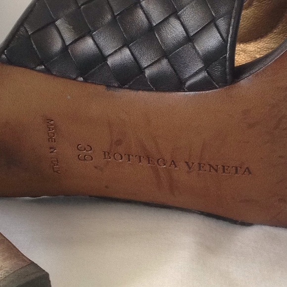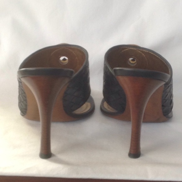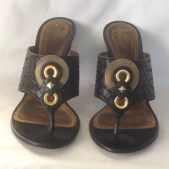 Bottega Veneta sandal heels. Black woven leather with gold detail. Wear can be seen on soles and where foot rest on shoe. When this pretty ladies are on they look perfect! Size...