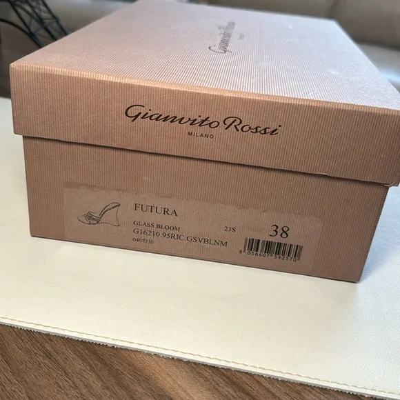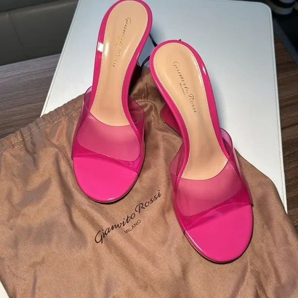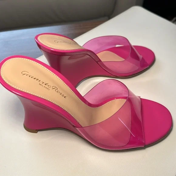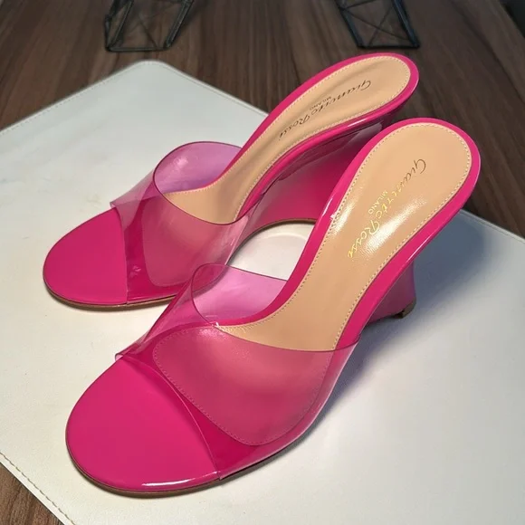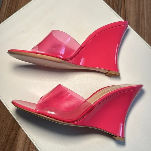 Futura wedge mules in a pink color, size 38 (US size 7.5). The shoes are crafted of translucent PVC with a leather sole. The wedge heel is 3.75" (95mm). Excellent condition, never worn. Original box, packaging and shoe bag included. Retail value $795Outer: Polyurethane 100%Lining: Calf Leather 100%Sole: Calf Leather 100%
