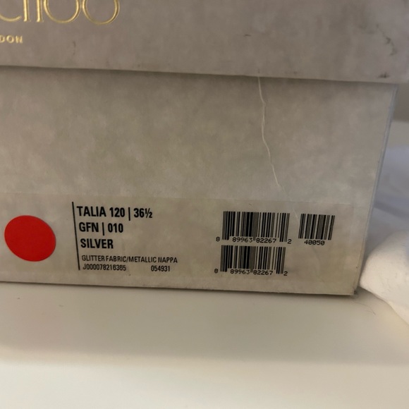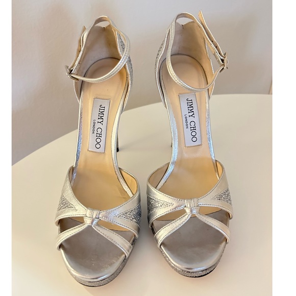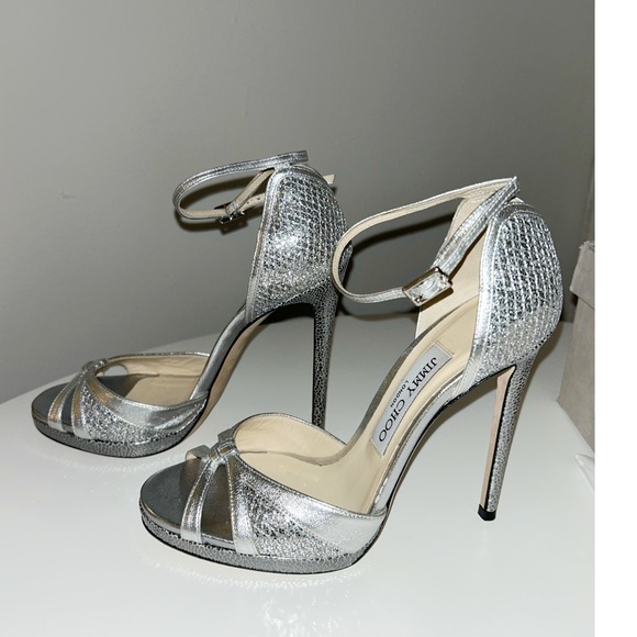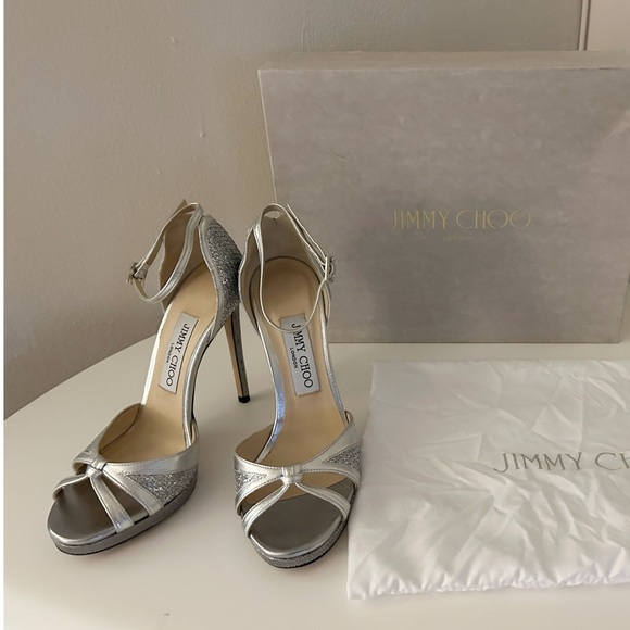 Jimmy Choo Silver Leather and Glitter Talia Strap Sandal HeelsSize 36.5Worn once for a few hours- in great condition!! Comes with original box and dust bag