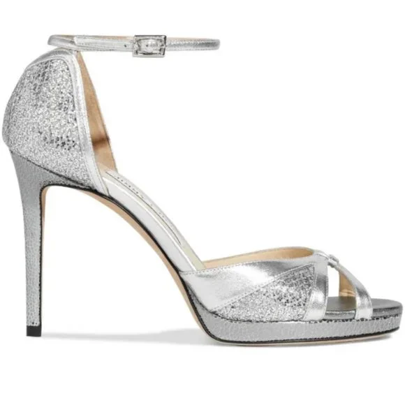 Jimmy Choo Silver Leather and Glitter Talia Strap Sandal Heels