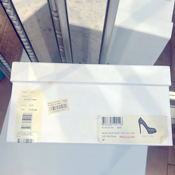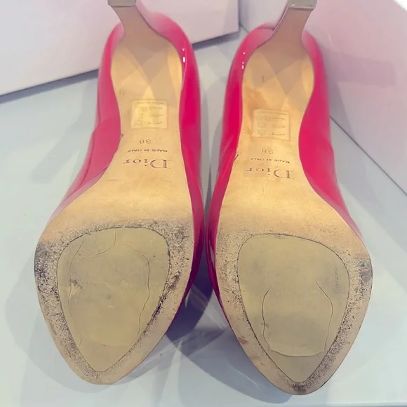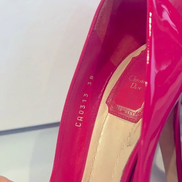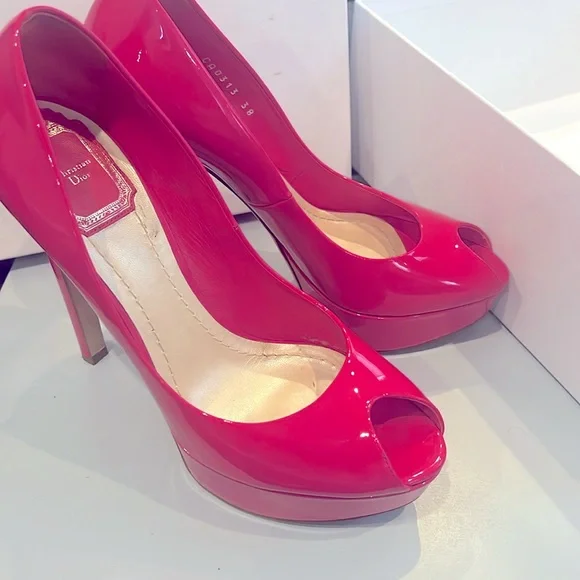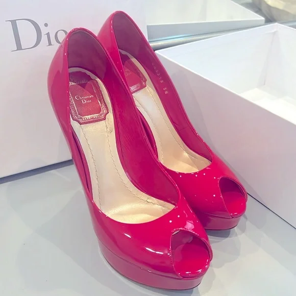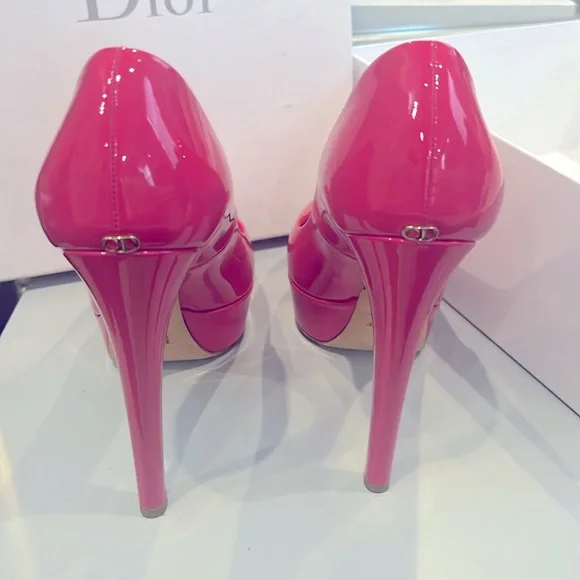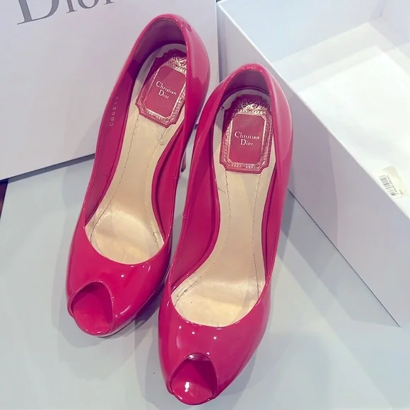 Patent leather peep toe pumps, Stiletto Heels with platform. Christian Dior designer lettering on leather sole, CD metalware at rear.Only worn 2 times. Includes box with tags. Designer Fit: Pumps by Christian Dior typically run a half size small.S240 Wild Rose (Designer Colour)5" heel with a 1 1/2" platformMade in Italy