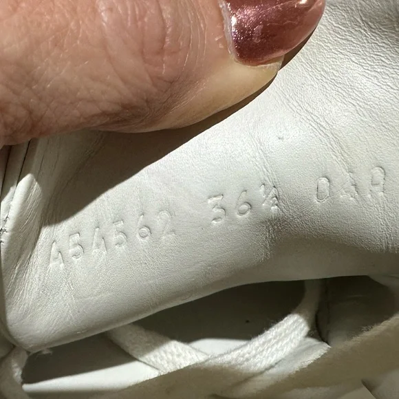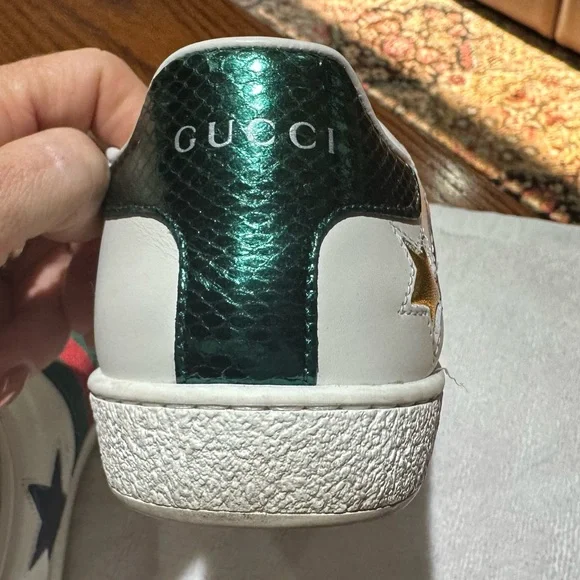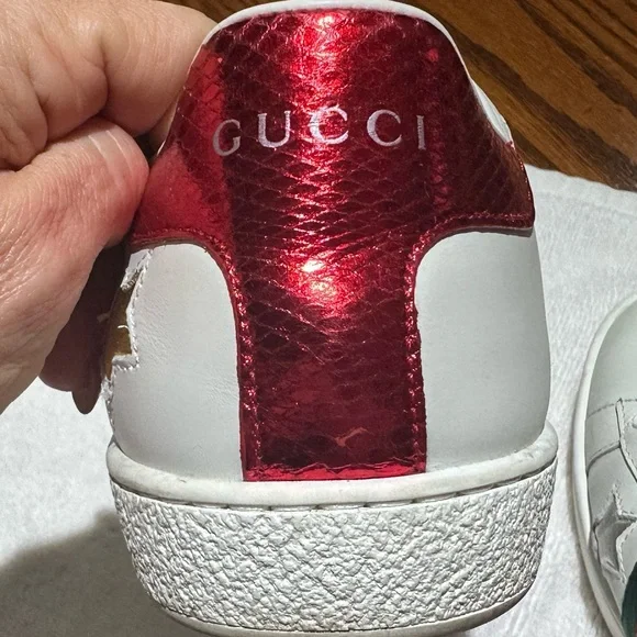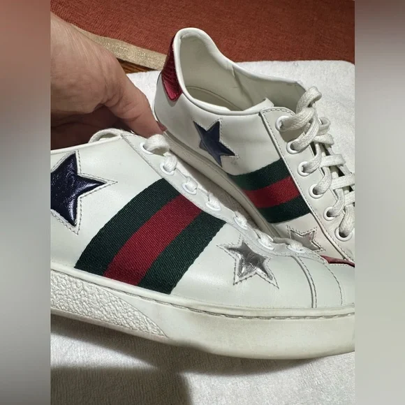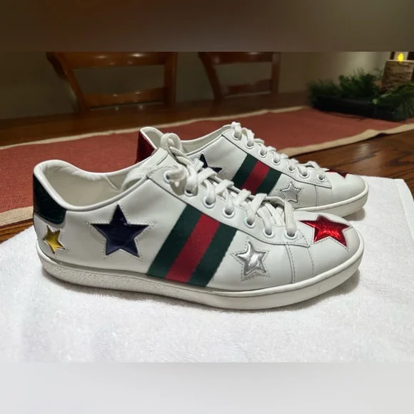 Authentic & Immaculately cared for and kept clean…white leather upper and insole, red, blue, gold, and silver star embellishments, red and green stripes, red and blue heel embellishments, sz 36.5, no marks or stains except soles (see all pics)