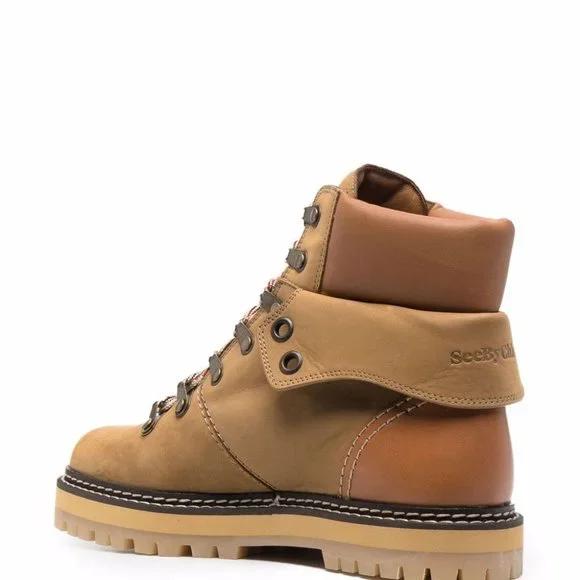 See By Chloé´s hiking boots have a layered cuff that only adds to the cool, chunky silhouette. Staying true to traditional designs, they´re made from light-brown nubuck with padded leather collars and gripped lug soles. Style yours with slim jeans and floral dresses alike.Fits small to size, take a 1/2 size larger than normalOnly available in full sizes, go up to the nearest whole size if you take a half sizeItalian sizingHeel measures approximately 30mm/ 1 inchLight-brown nubuck, tan leather (Calf, Lamb)Lace-up frontPerfectly chunky to ground your off-duty looks, the label´s Eileen hiking boots are trimmed in tonal leather against rugged Nubuck suede. Fold-down logo-embossed padded collar. Cotton laces. Rubber lug solesComposition: nubuck suede, leather, rubberPlatform height: 1"Made in Spain