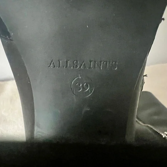 A modern lugged sole with block heel adds a modern twist to a classic black bootie. Side zip closure with leather upper and lining/rubber sole. Only worn once.Brand: All SaintsSize: 39Material: LeatherMeasurements: 4 & 1/4" heel; 1" platform; 5" boot shaft