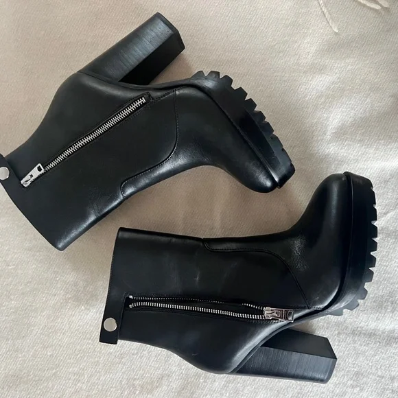 A modern lugged sole with block heel adds a modern twist to a classic black bootie. Side zip closure with leather upper and lining/rubber sole. Only worn once.Brand: All...