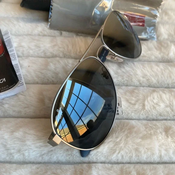 Brand new, perfect condition. Case and cleaning cloth included.Chrome silver titanium frames with blue detail.