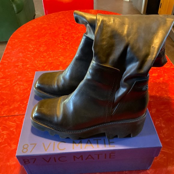 RARE! Vic Matié over-the-knee chunky boots size EU38(equivalent to 8 US). Made in Italy. Retailed for $485. Excellent pre-owned condition. Tiny divot approx 1/8" in the surface material above the ankle. Fantastic looking, well-made boots, great with short skirts or skinny jeans. Comes with box and cloth dust cover. Questions? Leave a comment below.