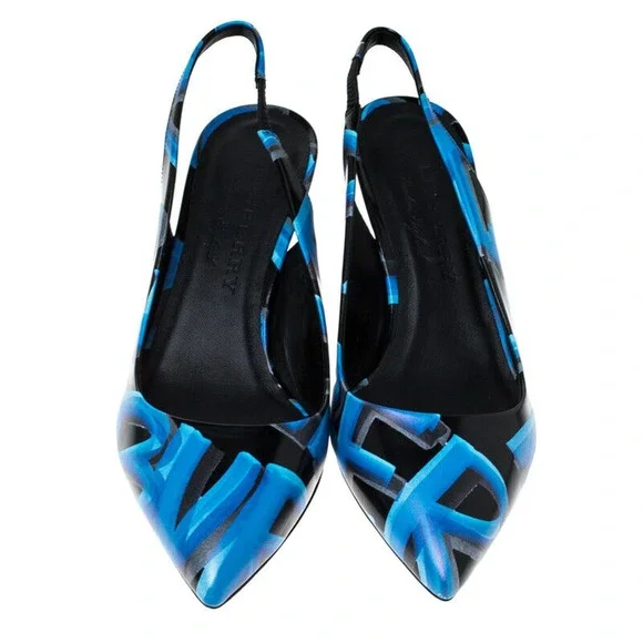 NIB BURBERRY MORSON BLACK LEATHER GRAFFITI LOGO PRINT KITTEN SANDALS PUMPS 37