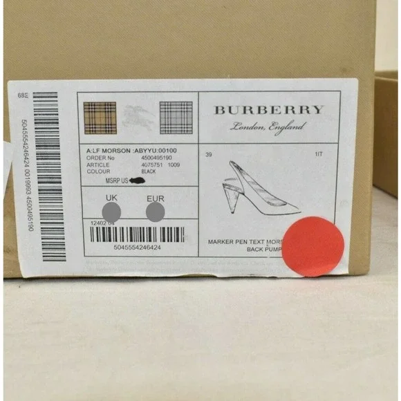 MORSON BLACK LEATHER GRAFFITI LOGO PRINT KITTEN SANDALS PUMPSBy BURBERRYMADE IN ITALY100% AUTHENTIC,GUARANTEED!!!COLOR: BLACK ( PRINT ON THE BOX)BLACK TONE POLISHED LEATHER UPPER"BURBERRY" LOGO PATTERN PRINTSLING BACKPOINTED TOESLIP-ON SILHOUETTELEATHER LINED"BURBERRY" PADDED LEATHER INSOLESIGNATURE "BURBERRY" LEATHER SOLE2-2/4" LEATHER COVERED KITTEN HEELSIZE EUR 37/ UK 4-PRINT ON THE SHOES AND BOX(FOR MOST PEOPLE FITS LIKE US 6.5)ORIGINAL PRICE $620NOTE !! THESE SHOES CAME FROM A FAMOUS STORE IN ITS ORIGINAL BOX.THEY ARE NEW BUT THEY ARE IN-STORE ITEM AND IT’S POSSIBLE THAT SOMEBODY TRIED THEM ON INSIDE THE STORE.THAT COULD CAUSE TINY EXTERIOR IMPERFECTIONS OR MARKS ON OUTSOLES THAT ARE INVISIBLE WHEN YOU WEAR THEM.THEY ARE NEW, IN GREAT CONDITION, BUT WE ARE STATING THEM AS A “NEW IN BOX - STORE ITEM”.NOTE!!!!! INTERNATIONAL BUYERS: IMPORT DUTIES, TAXES AND CHARGES ARE NOTINCLUDED IN THE ITEM PRICE OR SHIPPING COST. THESE CHARGES ARE THE BUYER´S RESPONSIBILITY. PLEASE CHECK WITH YOUR COUNTRY´S CUSTOMS OFFICE TO DETERMINE WHAT THESE ADDITIONAL COSTS MAY BE PRIOR TO BUYING.DM00880013<<<<