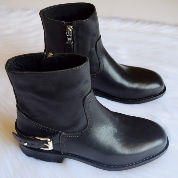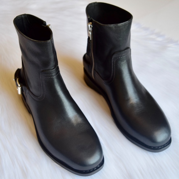 Rag & Bone Oliver Zip Moto BootiesSize: 36 New in BoxLightly distressed-leather Rag & Bone moto boots with a buckle strap accent at the heel. Exposed side zip. Stacked heel....